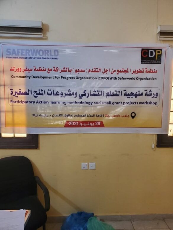 نظمة منظمة تطوير المجتمع من أجل التقدم بالشراكة مع سيفرورلد ، ورشة بعنوان منهجية التعالم التشاركي وإدارة المنح الصغيرة بمركز حقوق الانسان التابع الى جامعة نيالا بولاية جنوب دارفور ، وشاك فى الورشة عدد مقدر من الفاعلين فى مبادرات المجتمع المحلي والاجسام القاعدية .