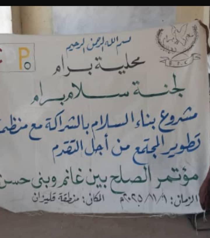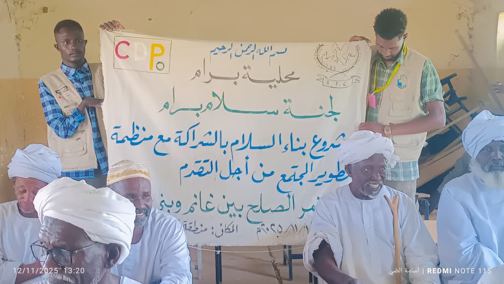 وسط اجواء من الفرح تم يوم امس الجمعة ١٤ نوفمبر ٢٠٢٥، بمنطقة قليزان بمحلية الردوم بجنوب دارفور، الصلح بين غانم وبني حسن من بطون قبيلة الهبانية ، بعد جهود وساطة قادتها لجنة الوساطة و لجنة سلام برام بالشراكة مع منظمة تطوير_المجتمع استمرت لأكثر من شهرين. ويذكر ان صراع عنيف اندلع بين غانم وبني حسن راح ضحيته ٩ أشخاص من الجانبيين قبل اكثر من عام بمنطقة كندي بمحلية برام بجنوب دارفور ادي الي نزوح مئات الاسر من المنطقة . وقد اسفر الحوار الذي استمرّ لأشهر وقادته لجنة الوساطة المكونة من قبل ناظر قبيلة الهبانية ولجنة سلام برام بدعم من منظمة تطوير المجتمع الي الاتفاق وعودة اكثر من ٢٠٠ اسرة الي منطقة كندي حتي الان.