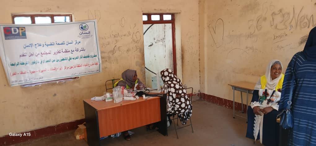 قامت مبادرة مركز انسان للصحة النفسية وعلاج الإدمان بالشراكة مع منظمة تطوير المجتمع من اجل التقدم بتنفيذ مشروع العيادات المتنقلة في مركزي إيواء النازحين (السافنا.... والحميراء ) في يومي ٩ و١٠ديسمبر تشتمل العيادة على الفحص المعملي الروتيني لأمراض الضغط والسكر والملاريا ... بالإضافة لمعاينة المرضى....ومعالجة الأمراض النفسية وتقديم العلاجات مجاناً وتستمر العيادة حتى ي م ١٤ ديسمبر الجاري.